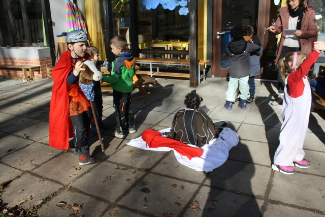 Zu Beginn haben die Kinder auf der Terrasse des Kindergarten Sausewind das Sankt Martinsspiel aufgeführt. Im Anschluss ging der Laternenumzug über das Gelände. An verschiedenen Stationen haben wir Lieder gesungen, bis wir wieder im Kindergarten Sausewind ankamen. Dort erwartete uns ein wärmendes Feuer sowie ein großes Buffet. Die Kinder haben alle ein Weckmann zum Teilen mit Eltern und Geschwistern bekommen, die morgens mit den Kindergartenkinder gebacken wurden. Jede*r konnte sich etwas Leckeres vom Buffet holen oder gemeinsam mit anderen am Feuer sitzen und Stockbrot backen.