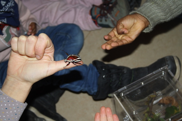 Sie haben erfahren, dass Insekten sechs Beine haben. Jedes Kind bekam die die Aufgabe ein bestimmtes Insekt, welches sie als Modell erhielten, unter den Ausstellungsstücken zu suchen.Zudem konnten sie verschiedene Insekten unter dem Mikroskop betrachten sowie Videos anschauen. Besonders aufregend war es für die Kinder, echte Insekten auf der Hand zu halten. Am meisten beeindruckt hat sie die australische Gespenstschrecke.